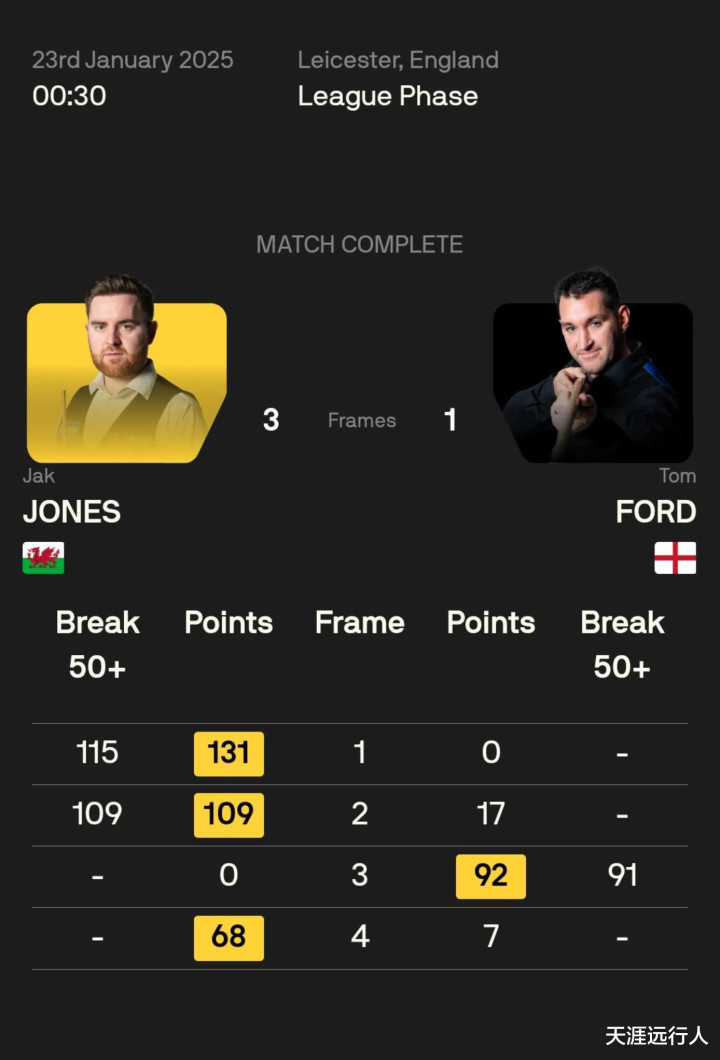 杰克·琼斯在首局的比赛中冲击147,打完15套黑红后,留步于黄球。