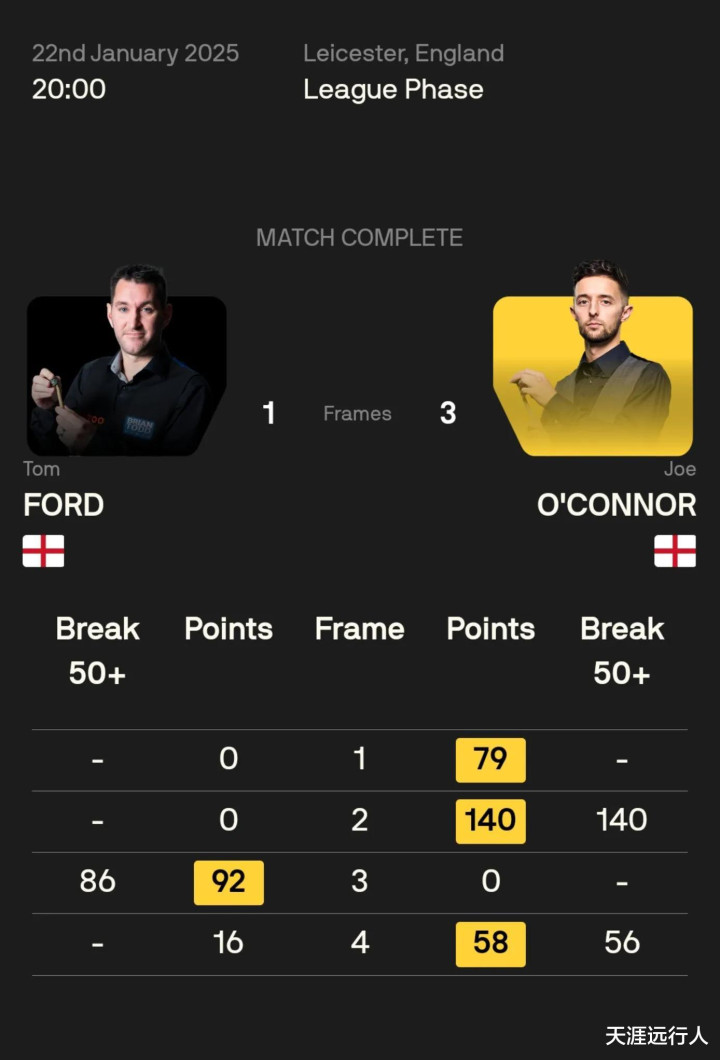 乔·奥康纳冲击147未果,轰出的140分暂列本组单杆最高分。